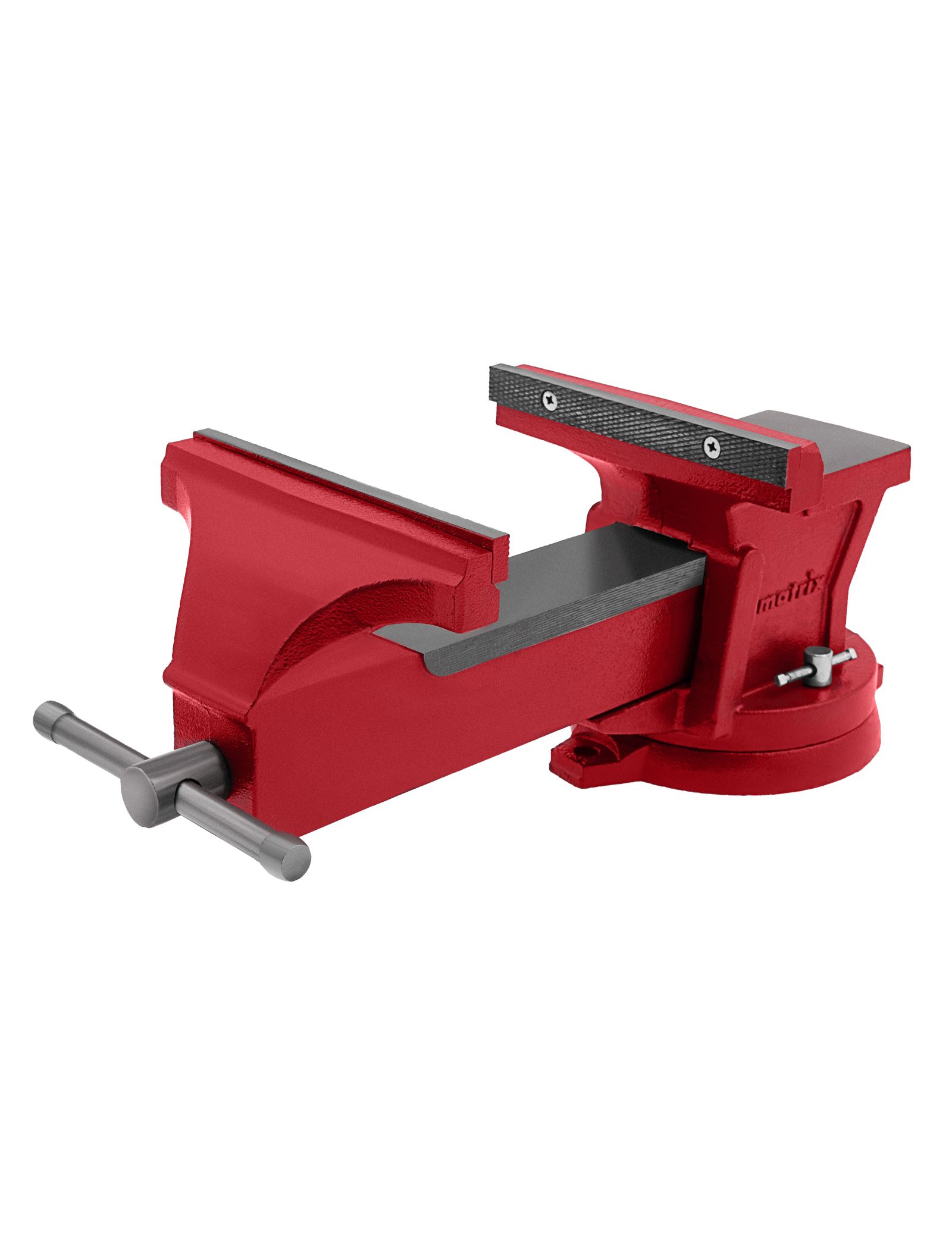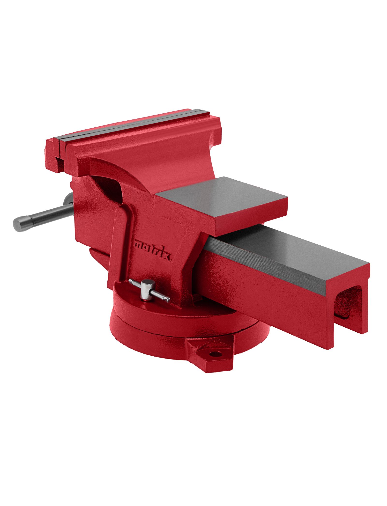 Поворотные слесарные тиски Matrix 18603 с наковальней и губками шириной 200 мм имеют рабочий ход 175 мм и предназначены для захвата и фиксации различных деталей. Поворотный механизм с прижимными винтами позволяет вращать тиски на 360° и фиксировать их в выбранном положении для удобной обработки заготовок с разных сторон. Инструмент используется для шлифовки, сверления и проведения других работ.
