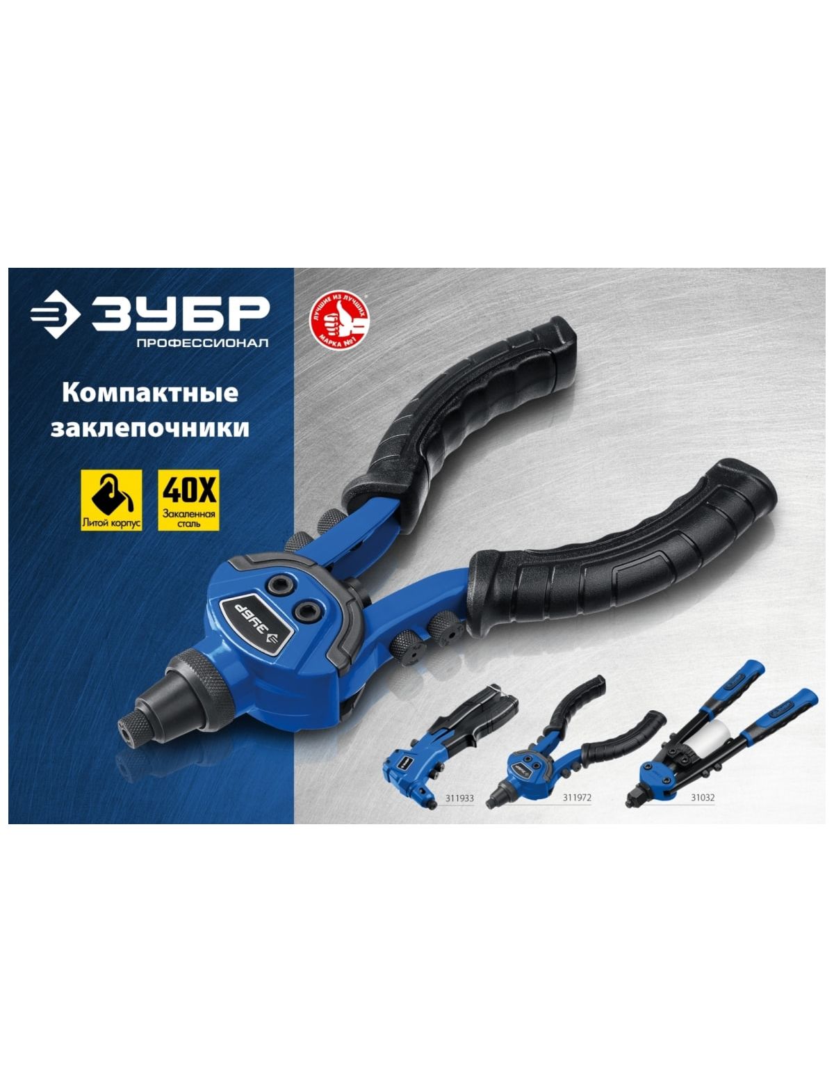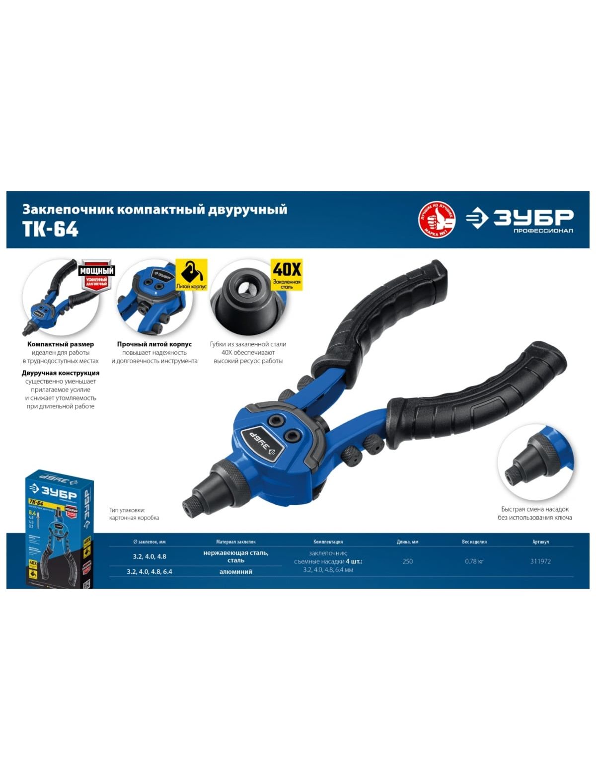 Литой компактный заклепочник ЗУБР Профессионал ТК-64 250 мм, 3.2 - 6.4 мм 311972 - это мощный и надежный, профессиональный инструмент для соединения листовых материалов с помощью заклепок.