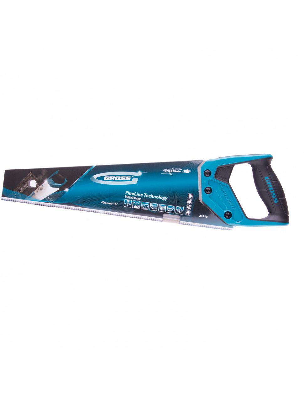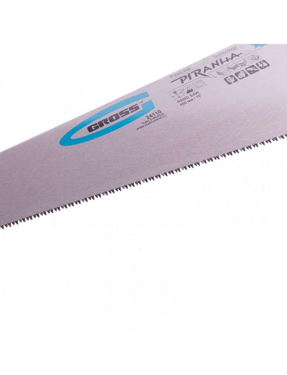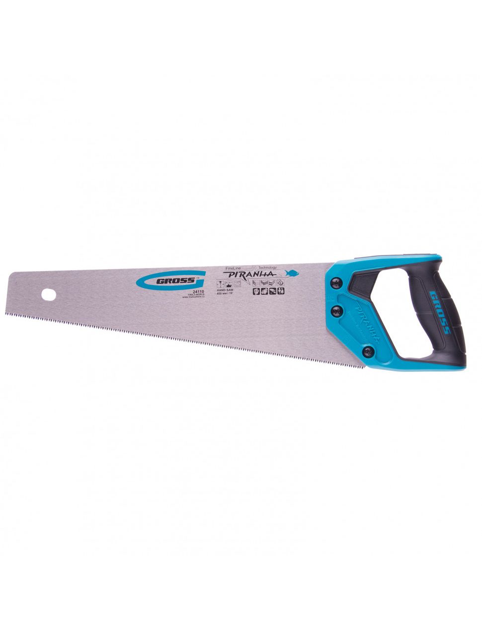 Ножовка по дереву 400 мм GROSS PIRANHA 24110 обладает высокопрочным полотном длиной 400 мм. Зубья имеют трехгранную лазерную заточку. Двухкомпонентная рукоятка обеспечивает комфортную работу и надежный хват инструмента во время пиления.