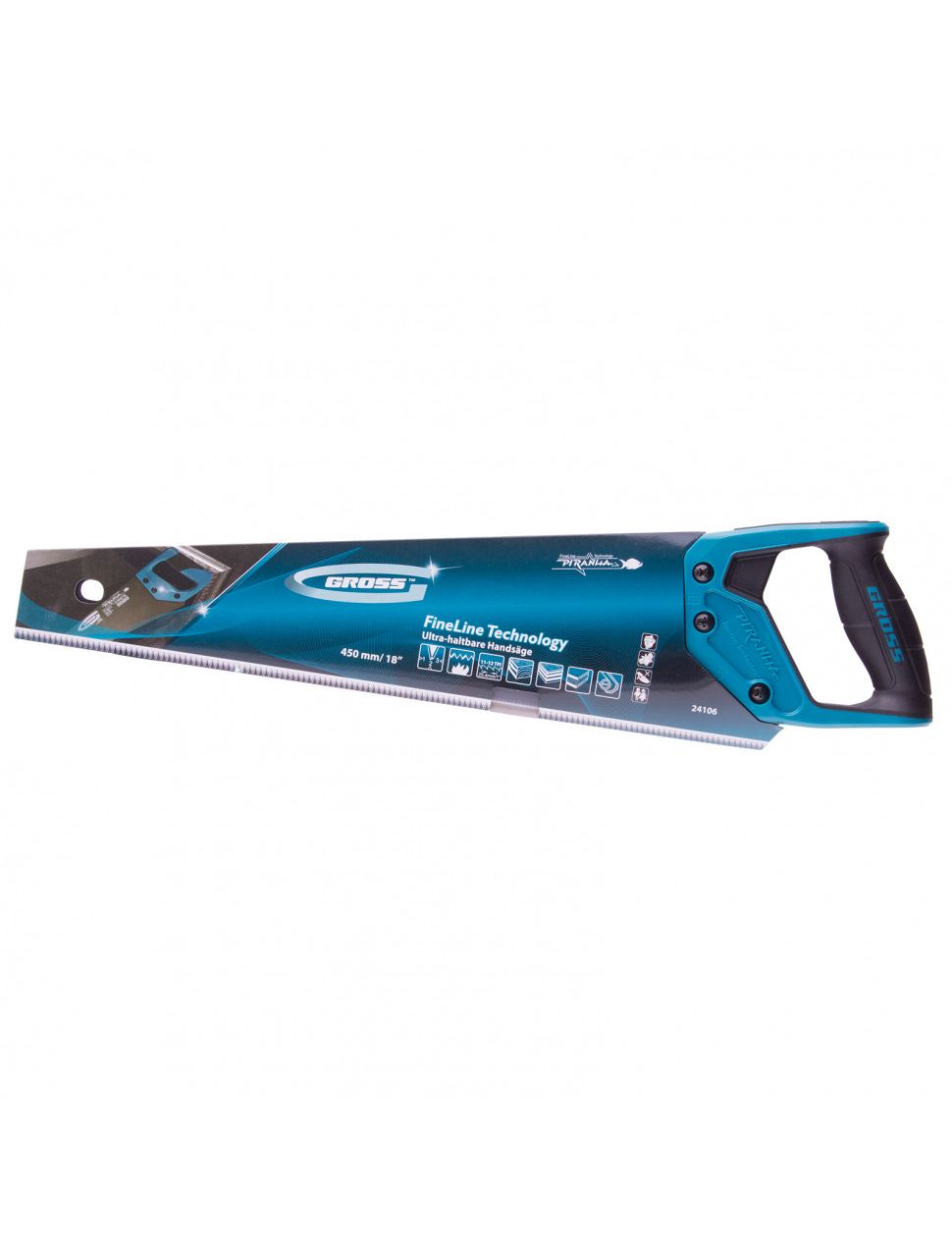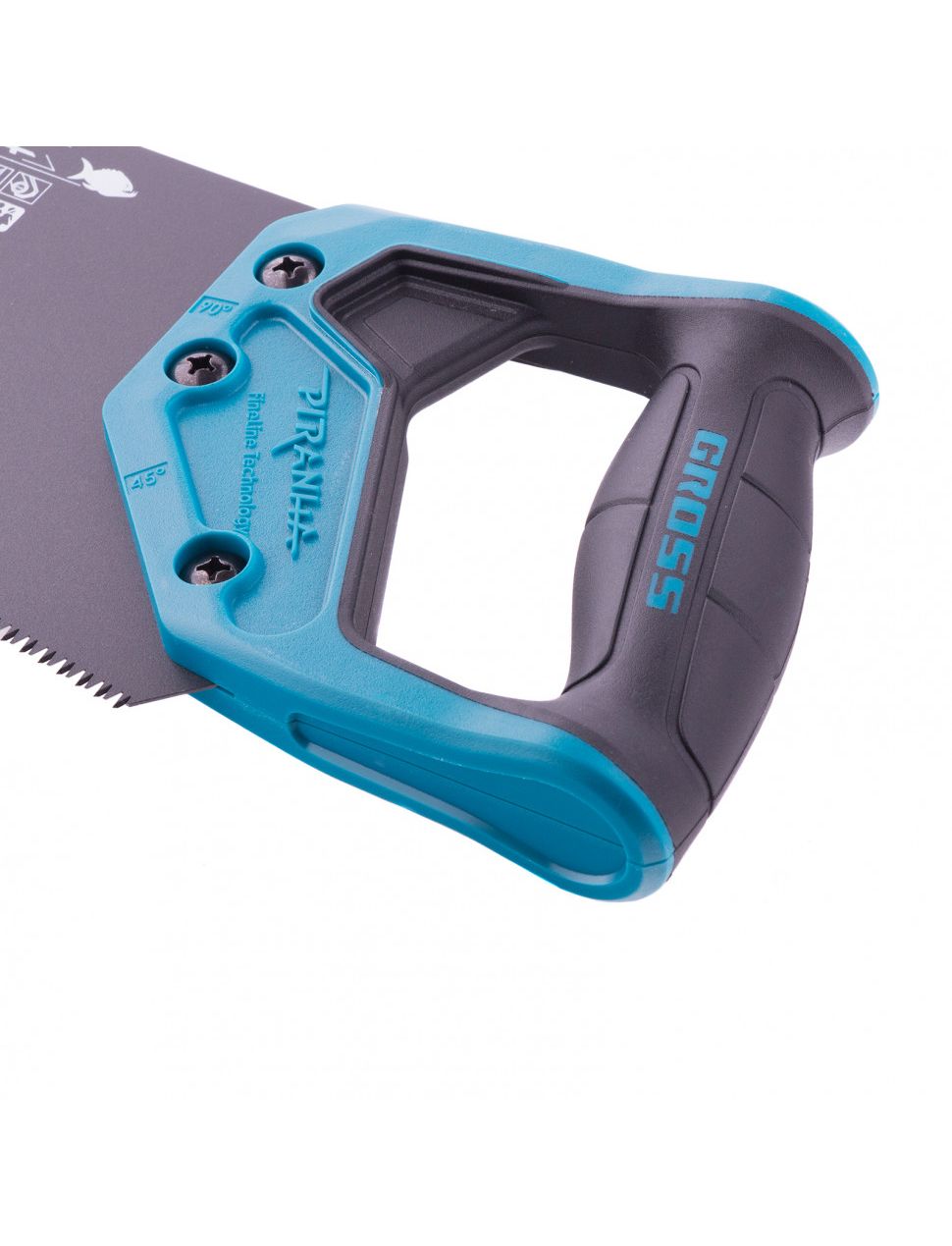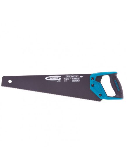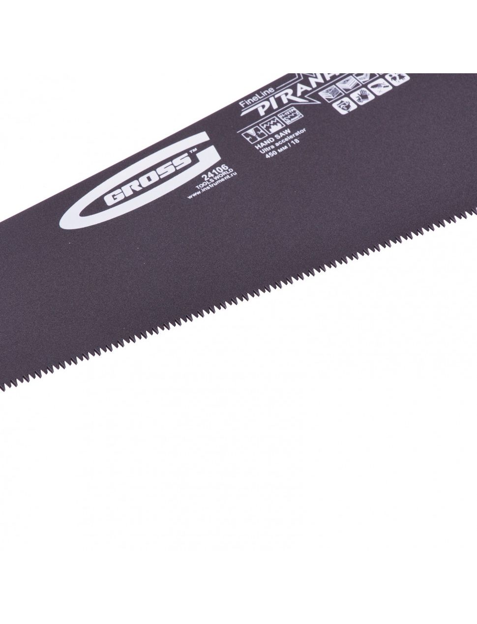 Ножовка по дереву 450 мм GROSS PIRANHA 24106 оснащена высококачественным полотном и выполняет чистое и быстрое пиление. Благодаря лазерной 3-D заточке зубья долго остаются острыми. На полотно ножовки нанесено тефлоновое покрытие для снижения трения и защиты от коррозии.