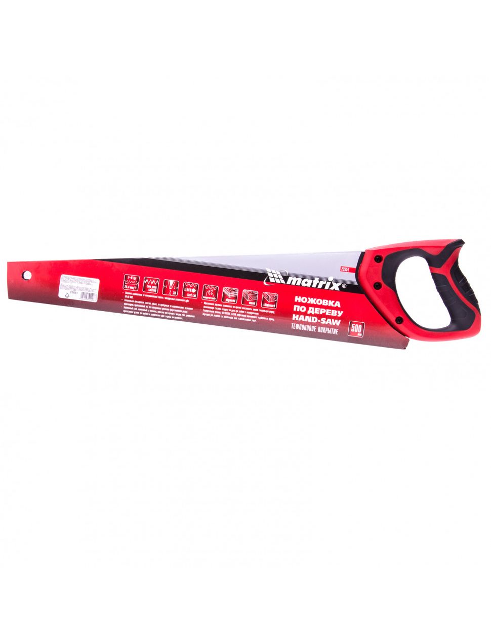 Ножовка по дереву 500 мм MATRIX 23551 - инструмент с тефлоновым покрытием полотна, которое изготовлено из стали 65Mn. Зубья прошли закалку, что увеличивает срок эксплуатации. Удобная рукоятка с накладками из резины способствует надежному хвату инструмента.