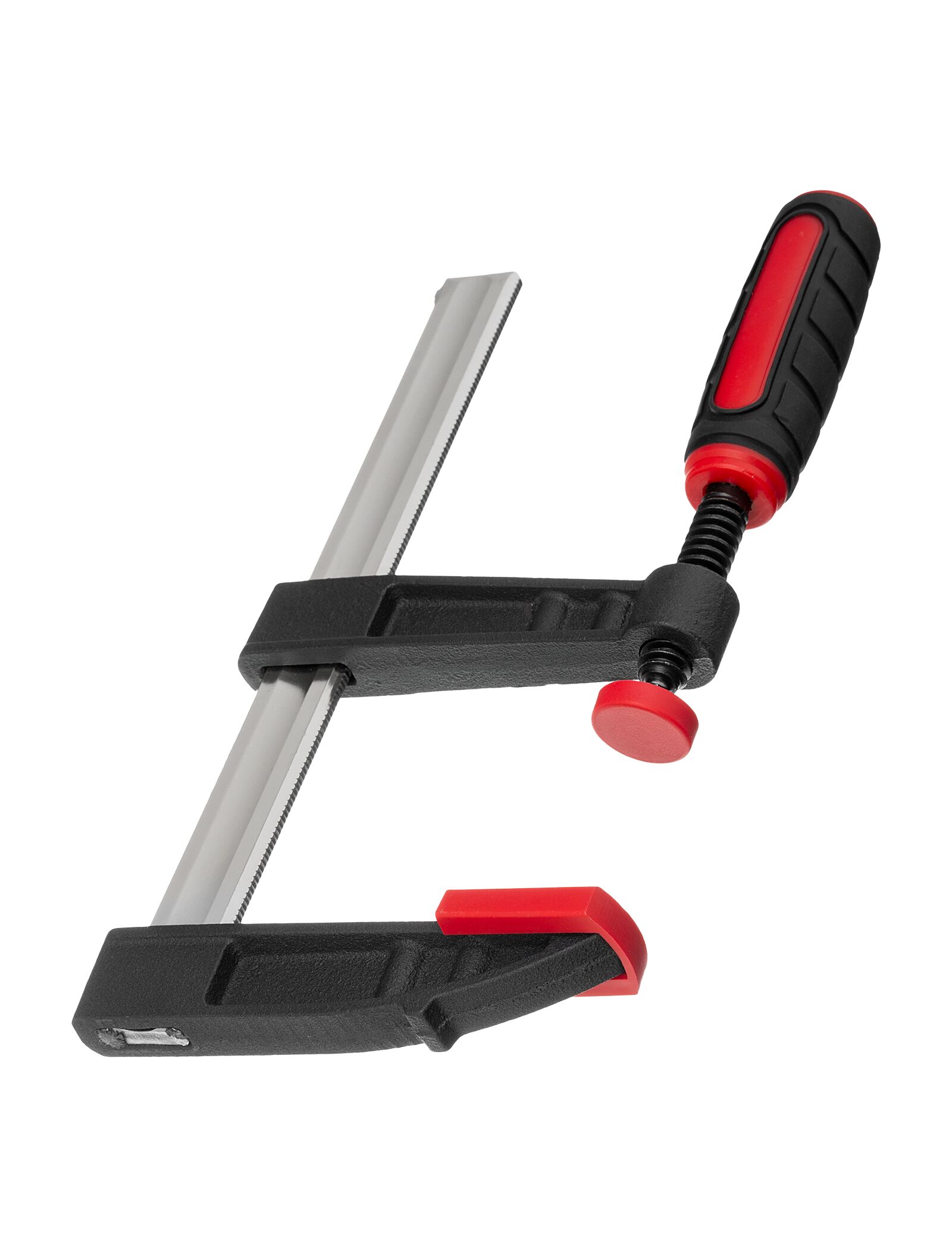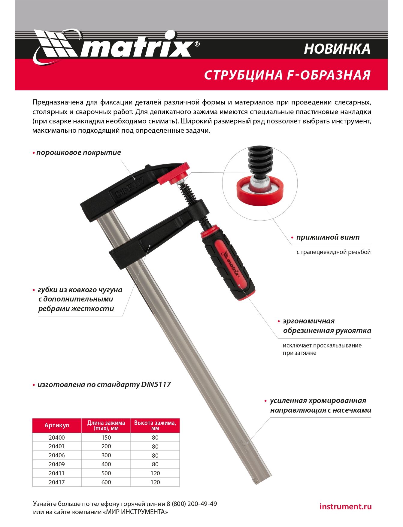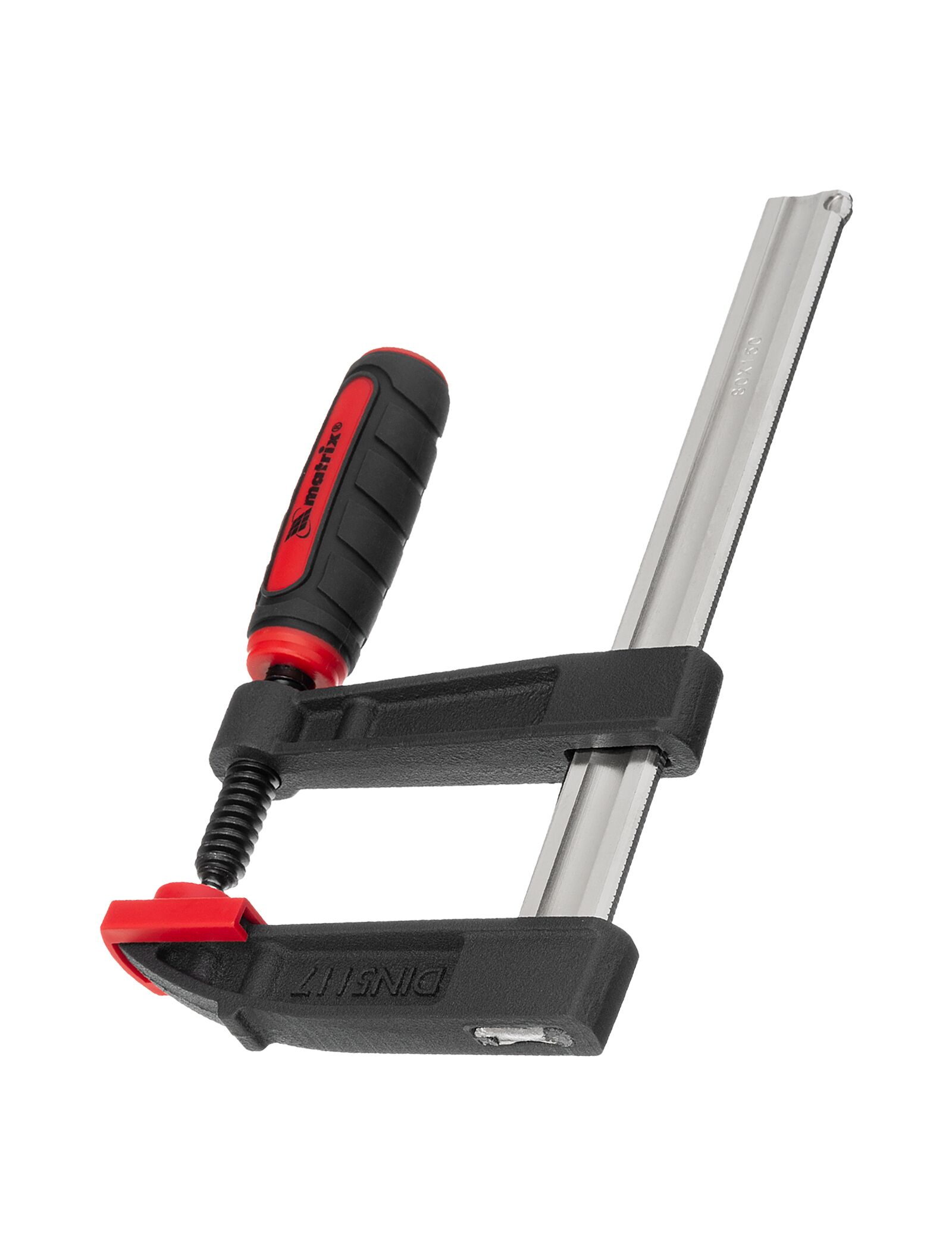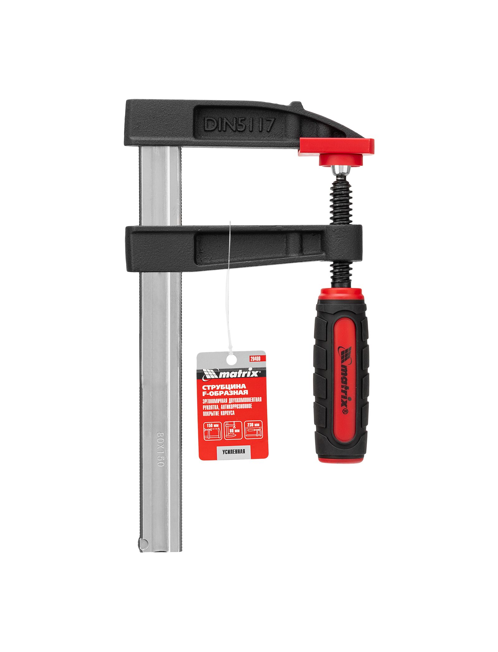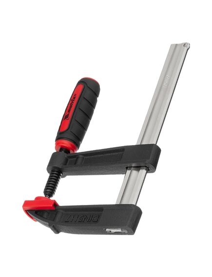 F-образная струбцина MATRIX 150x80x230 мм 20400 обеспечивает оптимальную силу сжатия, которая прижимает к верстаку детали либо удерживает их плотно сжатыми между собой. Для стягивания губок имеется удобная двухкомпонентная рукоятка.Прочный винт равномерно распределяет нагрузку по резьбе - исключает срыв. Штанга также выдерживает направленные нагрузки.