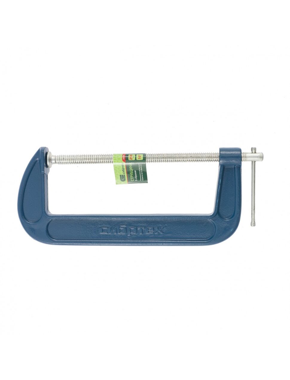 G-образная струбцина СИБРТЕХ 250 мм 20590 предназначена для фиксации предметов, например, при склейке или распиле. Корпус изготовлен из высокопрочного чугуна с шаровидным графитом. Резьбовой шток выполнен из стали марки ст3 и имеет оцинкованное покрытие для защиты от коррозии.