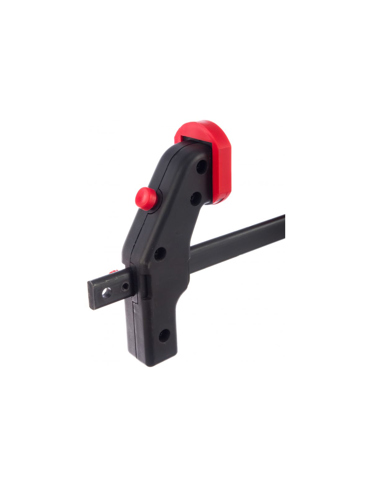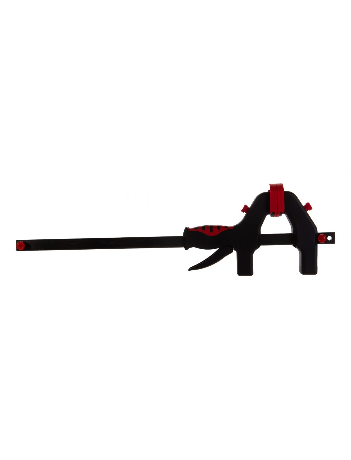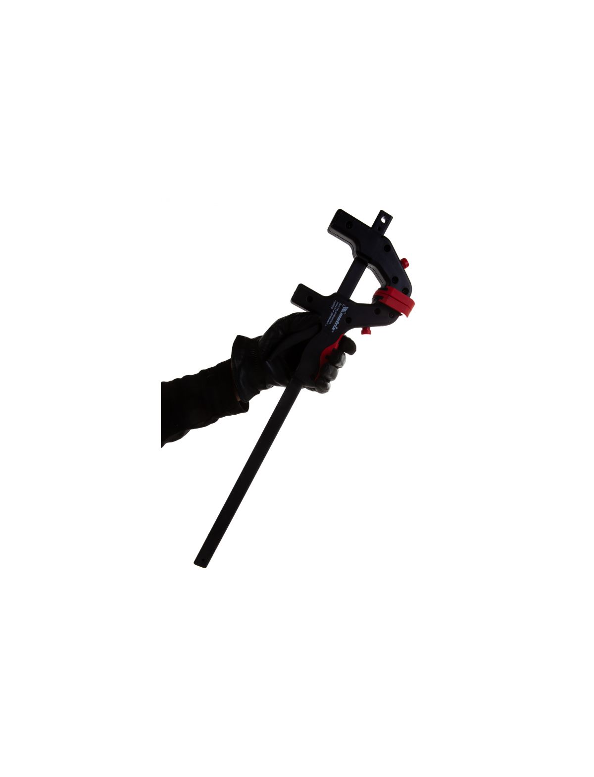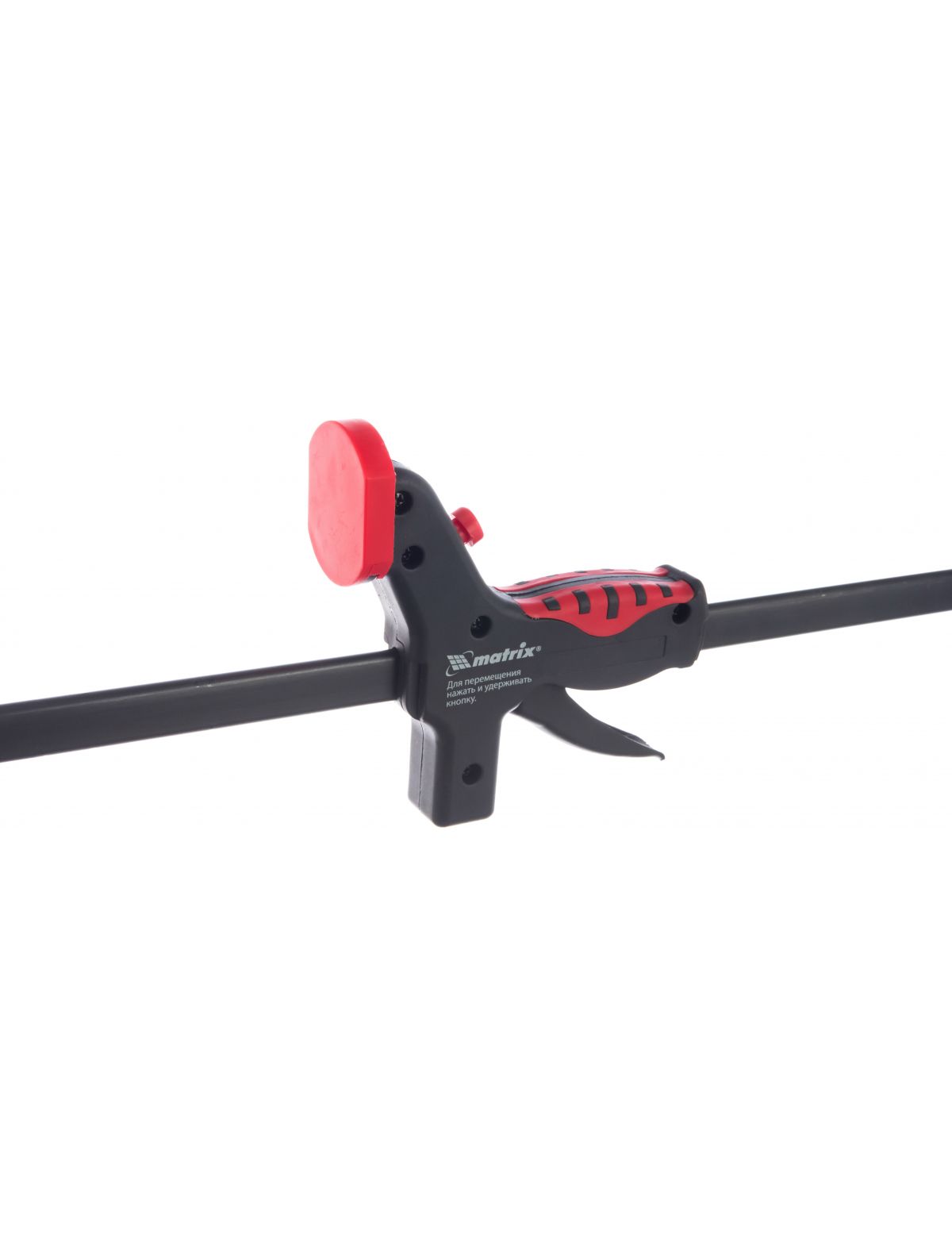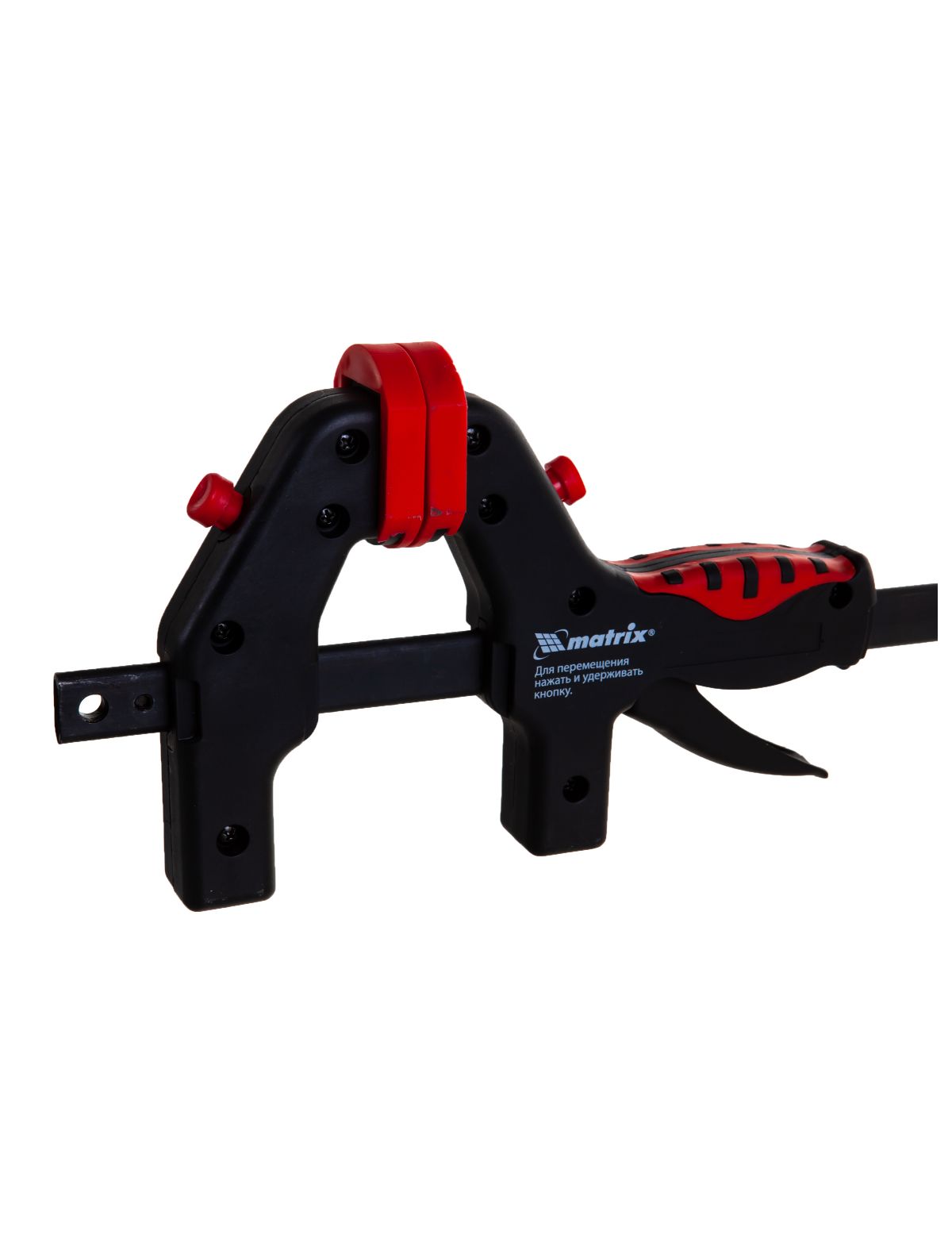 Струбцина MATRIX 20544 изготовлена из ударопрочной пластмассы. Направляющая стальная. Рабочие губки снабжены накладками для предотвращения повреждений обрабатываемых предметов. Опорная губка перемещается и фиксируется по всей длине направляющей при помощи ручки, а также может переставляться на другой конец направляющей, что позволяет использовать струбцину на разжим.