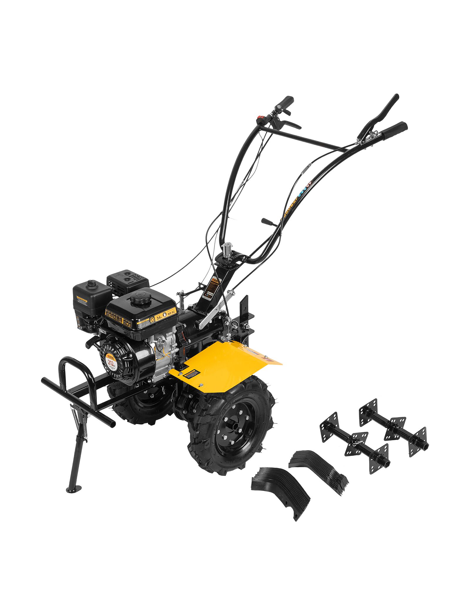 Мотоблок Denzel DPT-270X 56433 с двигателем объемом 212 см3 и мощностью 7 л.с., дисковым сцеплением, валом отбора мощности (ВОМ) и коробкой передач 2В/1Н используется для проведения различных сельскохозяйственных работ. Удобен для обработки участков большой площади: в комплект поставки входит 6 рядов высокопрочных фрез, обеспечивающих ширину 90 см и глубину вспахивания 35 см.