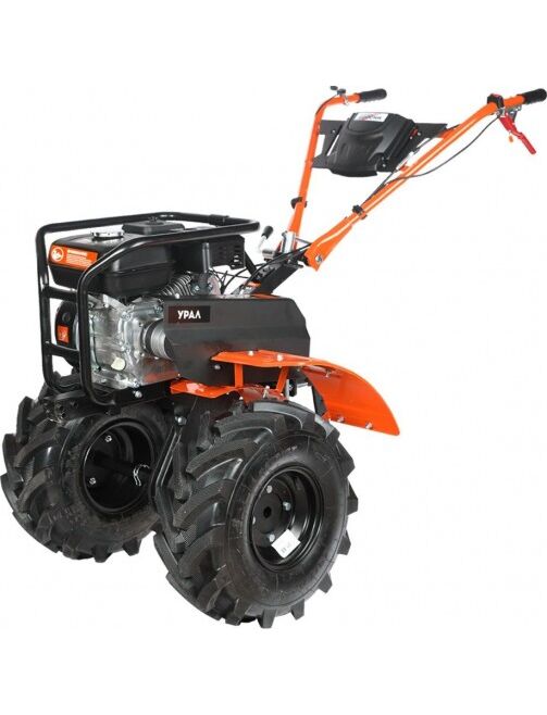 Урал - бензиновый мотоблок с 4-х тактным двигателем повышенного ресурса и цельнолитым чугунным шестеренчато-цепным редуктором. Конструкция рамы облегчает транспортировку мотоблока и защищает двигатель, глушитель и бензобак. 4 скорости вперёд 2 назад. Двойное сцепление позволяет переключаться с пониженной на повышенную передачу даже во время движения. На сцепку устанавливается навесное оборудование или тележка. В комплекте закаленные фрезы, широкие колеса Extreme с глубоким протектором, сошник. Кнопка включения, рукоятка газа и рычаг привода расположены на руле. Наклон руля регулируется.
