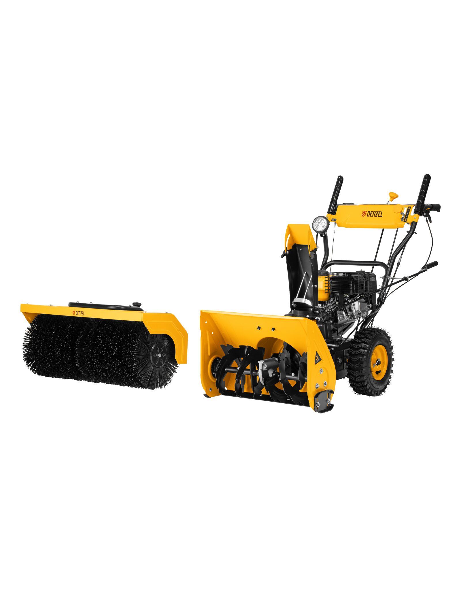 Гибридная снегоуборочная машина Denzel SWB-800 97662 с двигателем объемом 212 см3, ручным стартером и 2 насадками, предназначена для очистки территории от снега, а также может использоваться для уборки листвы, грязи, пыли и мусора. Благодаря приводу на колеса машину не нужно толкать. Ширина обработки щеткой составляет 800 мм, ширина снегоуборочной насадки — 560 мм при высоте захвата 430 мм. Машина позволяет быстро расчистить дорожки, тротуары, территорию парковки и т.д.