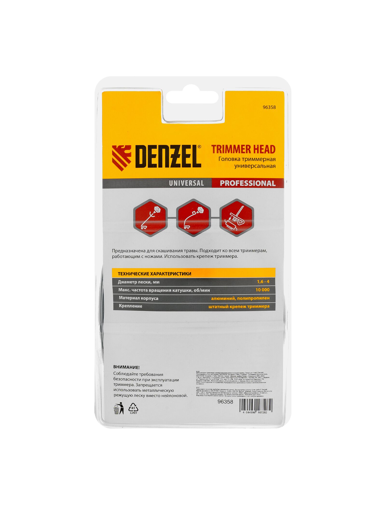 Универсальная триммерная головка Denzel 96358 сочетается практически со всеми моделями бензиновых кос марок Denzel, Сибртех, Patriot, Husqvarna, Huter и других с крепежом М10х1,25 и левой резьбой. Катушка подойдет для любого крепежа, который прилагается к Вашему триммеру.