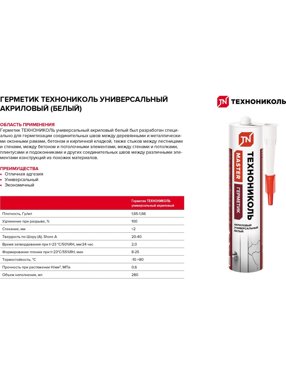 Универсальный акриловый герметик Технониколь белый, 280 мл качественный универсальный герметик на основе акриловой дисперсии. После нанесения продукт формируется в мягкую пластично-эластичную резину путем испарения воды из герметика.