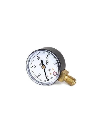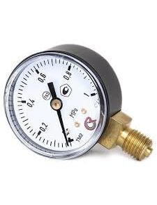 Манометр является неотъемлемой частью редуктора, вкручивается в основание с резьбой М12х1,5 с помощью ключа на 14. Штуцер имеет радиальное расположение и выполнен из латуни. Предназначен для измерения давления газа при температуре окружающей среды от -20 С до +60 С. Точность 2.5 достигается за счёт применения медной трубки Бурдона – уникального измерительного элемента. Стальной корпуса манометра диаметром 50 мм защищён техническим (органическим) стеклом, циферблат выполнен из алюминия.
